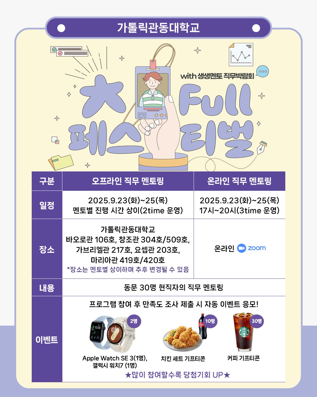 가톨릭관동대학교에서는 교내 재학생 및 졸업생, 지역청년 대상, 현직자 멘토링을 통해 폭넓은 진로선택의 기회를 제공하기 위해 ‘가톨릭관동대학교 2025년 大 Full 페스티벌 with 생생멘토 직무박람회(이하 직무박람회)를 실시하고 있습니다.